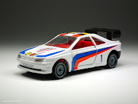 For years I thought that in this model Poliguri had tried to reproduce the Peugeot 405 Turbo 16 "Pikes Peak" – I was wrong. This is actually the much lesser-known Peugeot 405 Turbo 16 Group S prototype, unveiled in 1987. Once again, Poliguri presents us with a well-proportioned and detailed model, featuring clear plastic headlights skillfully integrated into the mold, as well as functional and robust doors. The paint, glossy or satiny depending on the colors, is usually well applied. The reasonably detailed interior features a rear seat, an acceptable compromise given that Poliguri also offers a road version. As in the Fiat Uno, the doors resist, within certain limits, intensive use, but after a few years they stop closing properly, due to the deformation of the sills close to the front fenders. However, in most examples this deformation is not very expressive and almost imperceptible. For all intents and purposes, Poliguri bequeaths us the only "3-inches" model of this Group S prototype ¹, whose circumstantial evolution would leave an amazing mark on African deserts – as well as on a certain American hill climb. This automobile, the Peugeot 405 Prototype, is in my collection under the themes "French Vehicles", "Concept Cars" and "Race Cars". ●